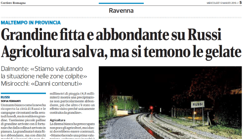 Corriere Romagna del 13 marzo 2019: “Grandine fitta e abbondante su Russi. Agricoltura salva, ma si temono le gelate”. Dalmonte: “Stiamo valutando la situazione nelle zone colpite”. Misirocchi: “Danni contenuti”