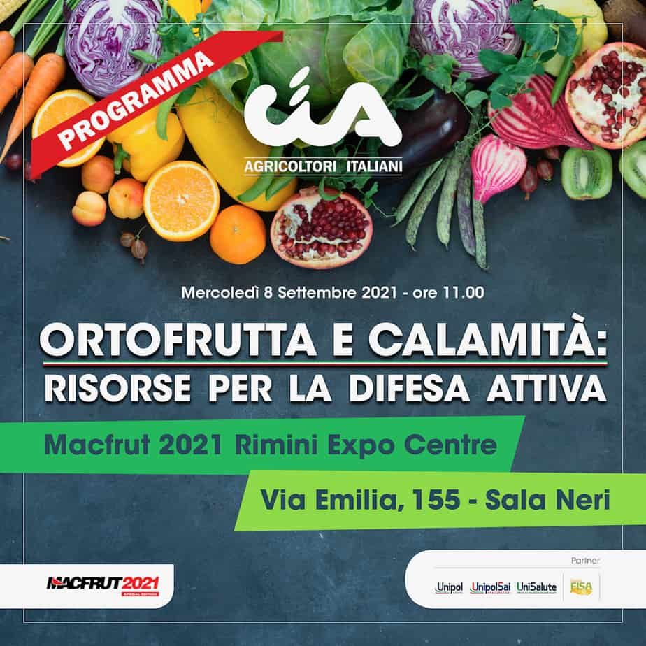 Mercoledì 8 settembre, dalle ore 11.00 alle ore 13.00, in occasione di Macfrut 2021 Cia Nazionale organizza il convegno “Ortofrutta e calamità –Risorse per la difesa attiva”. L’evento si terrà presso la sala convegni Neri di Rimini Expo Centre.